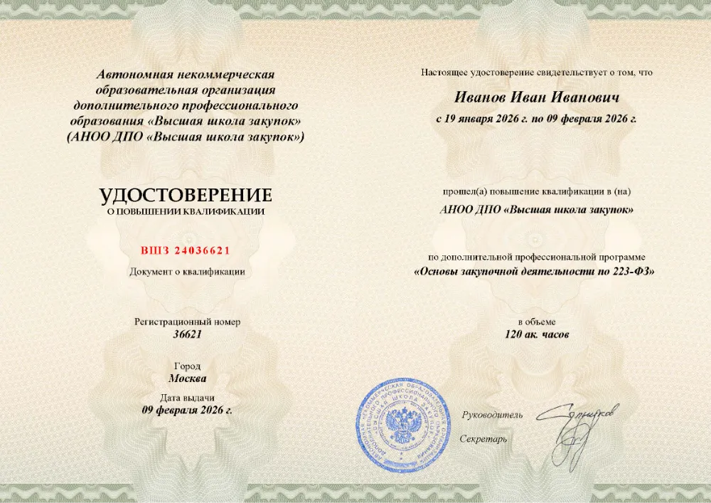 Вы получаете официальное удостоверение о повышении квалификации. Высшая школа закупок (fz44.org) в обязательном порядке вносит сведения об обучении в Луганске в реестр ФИС ФРДО, подтверждая легитимность вашей подготовки перед контролерами.