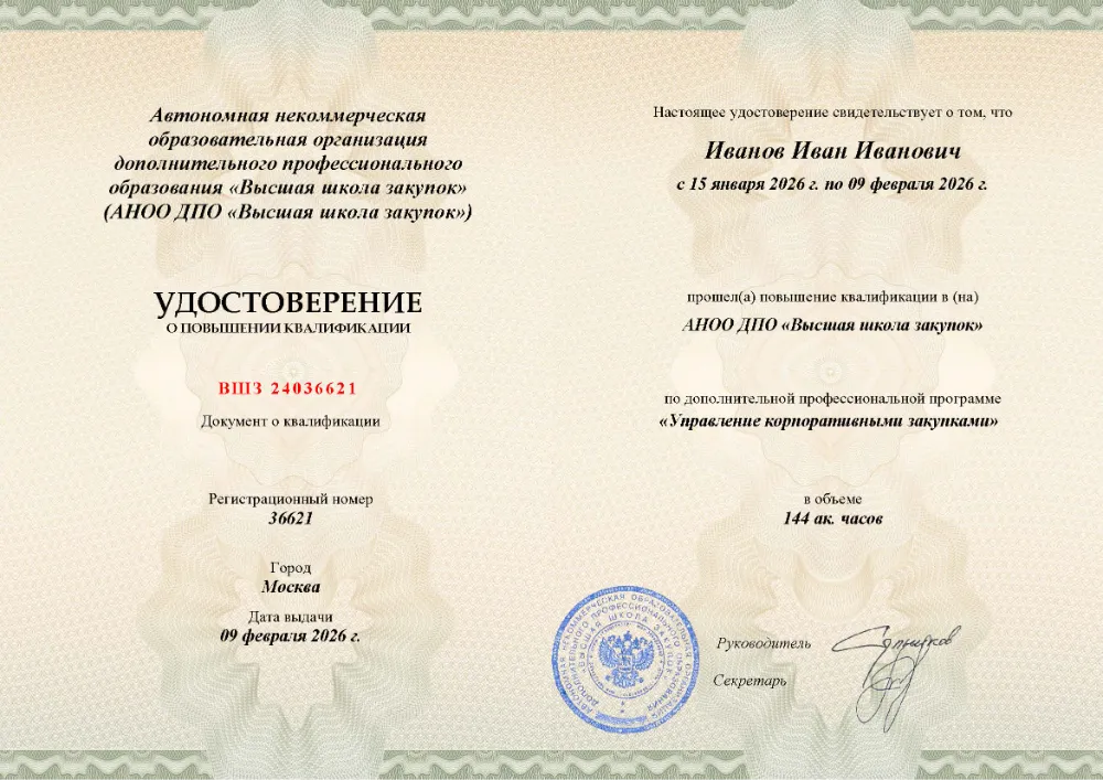 Вы получаете официальный документ о повышении квалификации. Высшая школа закупок (fz44.org) в обязательном порядке вносит сведения об обучении в Луганске в реестр ФИС ФРДО, подтверждая легитимность вашей подготовки перед контролерами.